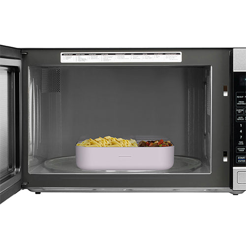 A hot lunch is just a trip to the microwave away with Bentgo Modern. Beveled feet at the bottom of the tray fit seamlessly back into the outer shell after food has been heated.