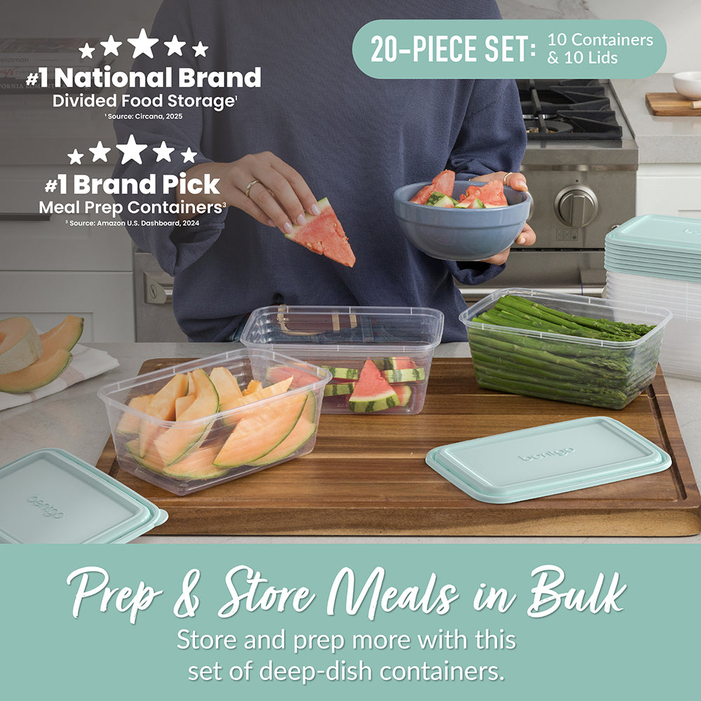 - #1 Brand Pick for Meal Prep Containers: Bentgo is the top pick for meal prep containers!* This 20-piece set includes 10 containers and 10 lids, perfect for prepping family meals, storing large batches of ingredients, and storing leftovers to enjoy later.